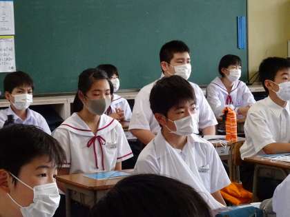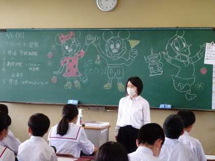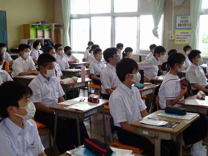 教室に集まり、入学式前の学活です。緊張した姿が見られます。
