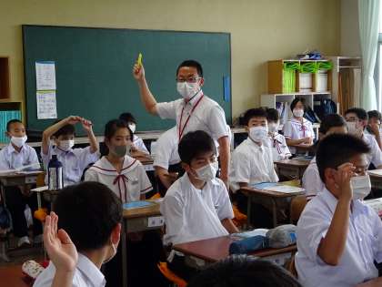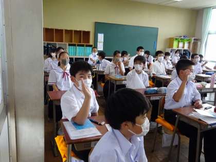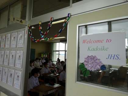 いろいろな説明を受けています。ちゃんと頭に入ったかな?教室の飾り付けがとてもきれいですね。