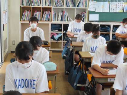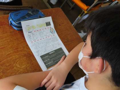 学級だよりを読みながら栗田先生が話をしています。その時に3年生が、鉢植えの花を持ってきてくれました。代表者が受け取りました。ありがとうございます。