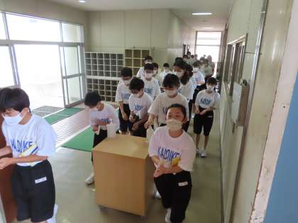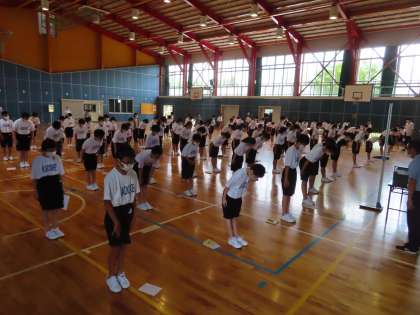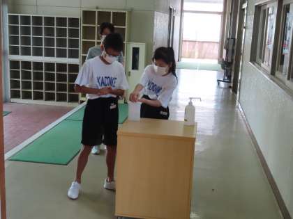 1年生とI組の身体測定の時間です。体育館に入る前はアルコール消毒です。
