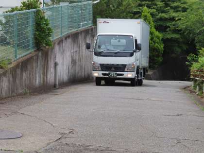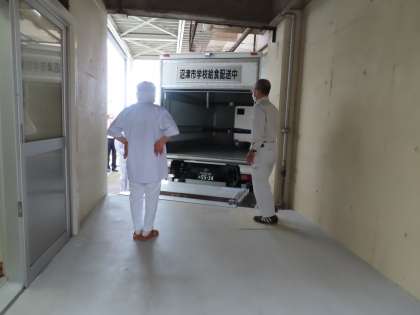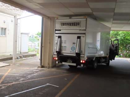 門池中学校の給食搬入口は天井が低いため、トラックはぎりぎりでした。