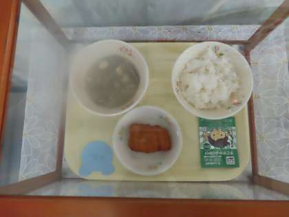 写真はサンプルです。今日の給食は、ごはん・豚汁・魚フライ・デザート・牛乳です。