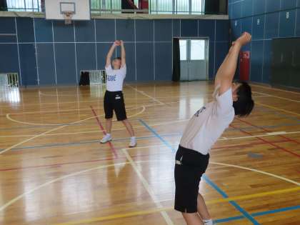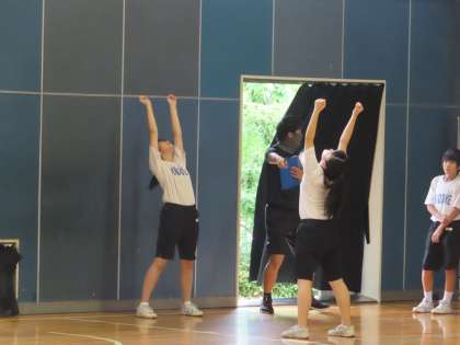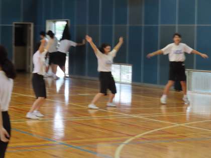 3Aは知野先生の体育です。体育館でラジオ体操の復習をしています。グループごと間隔を開けての練習です。最後に集合するときにはマスクをつけて話を聞いていました。