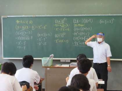 3Bは数学の授業でした。時田先生が乗法公式の説明をしています。マスクをつけフェイスガードをつけての授業でした。質問に対して接近して教えるため、フェイスガードを使っているようです。