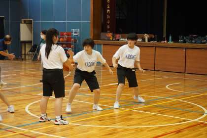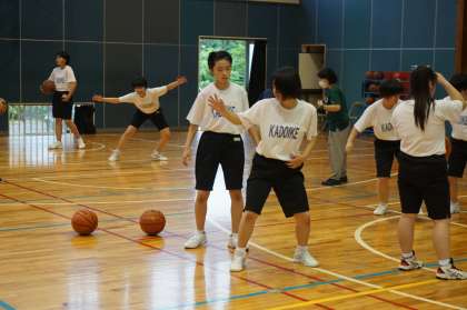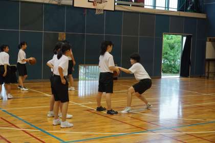 女子バスケ部は上級生と一緒にフットワークの練習をしていました。上達するには基本練習をおろそかにしてはいけません。一つ一つのことをしっかり身につけていきましょう。