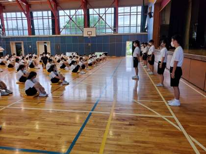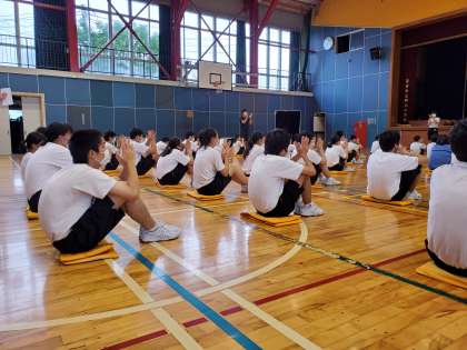 学年を引っ張る前期学年委員会のメンバーが、今後の抱負を発表します。聞いている生徒たちも拍手や合わせ礼を意識しながら聴いています。最上級生として、後輩たちの手本になる姿を見せていってください。期待しています!