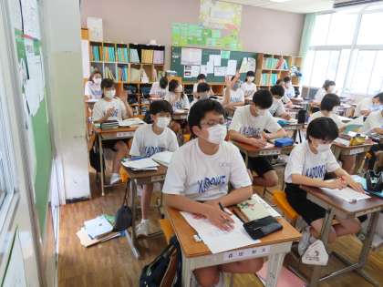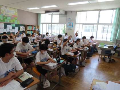 2Cは国語の授業です。倒置法、擬人法、擬態語などについて学習していました。2Cも少し、エアコンの風を感じました。
