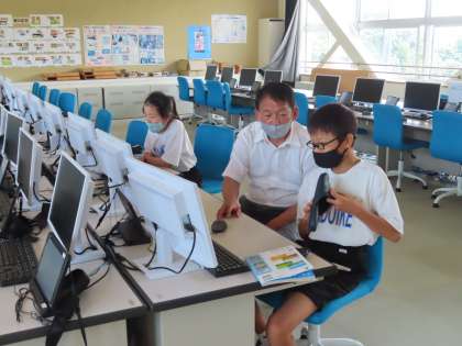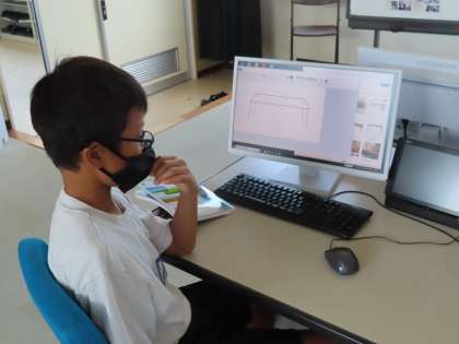 4時間目は山本先生の授業です。パソコン室でパソコンとマウスの扱い方を学習していました。マウスを使って、机を描いていました。