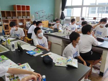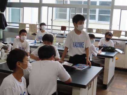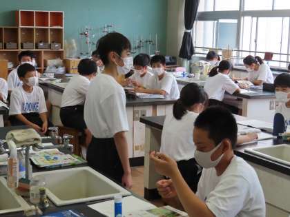 1Cは理科の授業です。生徒の芳賀さんが司会をして、次から次へと指名していきます。多くの意見が出ていました。