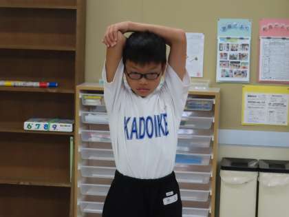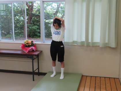I組はトレーニングをしていました。ラジオ体操とストレッチです。このあとグランドで走り込みが待っています。頑張っています。
