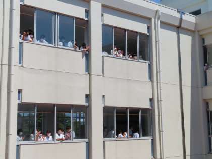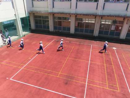 司会者は2年生の2人が行っています。ソフトテニスのボールを使っていたので、ボールがとりにくそうでした。