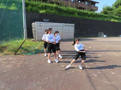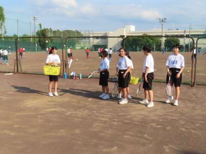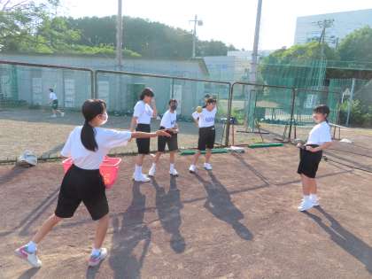 テニス部は、ボールを簿ケットに入れる練習です。サーブを打つときに半身になり身体をひねることを掴むそうです。2年生に教えてもらいました。
