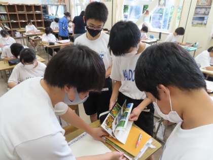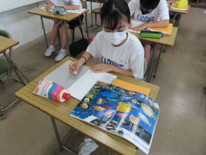 2Aは美術です。学校祭である「渓流祭」のポスターづくりに入っていました。今年は夏休みが短いため授業でどんどん進めていきます。