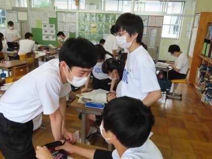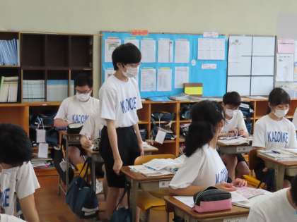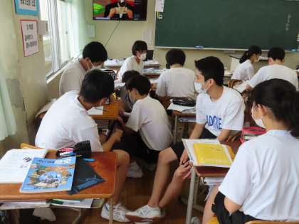 3Cは社会の授業です。「伊藤博文は国会の開設に向けてどんなことをしたのか」を考え、話合いをしていました。前後左右の生徒と意見交換をしていました。