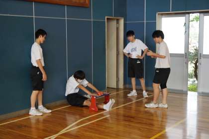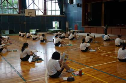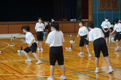 2Aは保体の授業です。新体力テストの種目に取り組みます。長座体前屈や反復横跳びを行っています。密にならないような配慮がなされています。