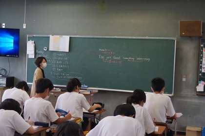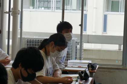 現在完了形についての学習です。現在完了形のときに使われる単語について、例をあげて考えています。山開さんが支援に入っています。