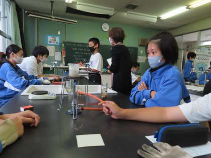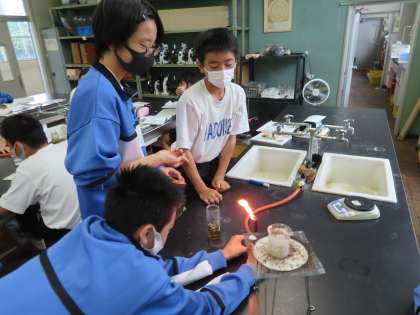 1Cは理科の授業です。実験をしていました。「物質が液体から固体へと状態変化するとき、体積と質量は変わるのだろうか?実験ではビーカーの中入った「ろう」をバーナーの火で溶かす実験をしていました。