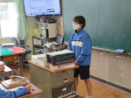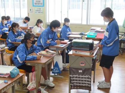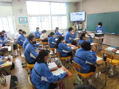 2Aは国語でした。本の紹介を生徒が工夫し、わかりやすく発表していました。遠藤さんは「リカと言う人物」の紹介を、岡本さんは「四字熟語について」の紹介をしています。みんなへの質問があったりクイズがあったりわかりやすい紹介でした。