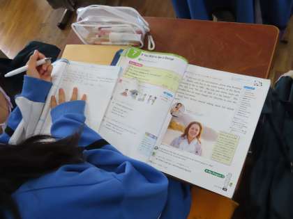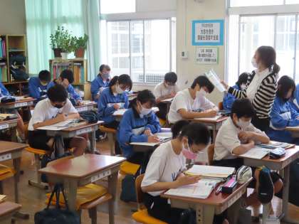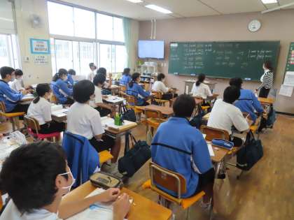 2Bは英語の授業でした。プログラム7−1の内容を絞って説明していました。重要ポイントをノートに書き移しています。
