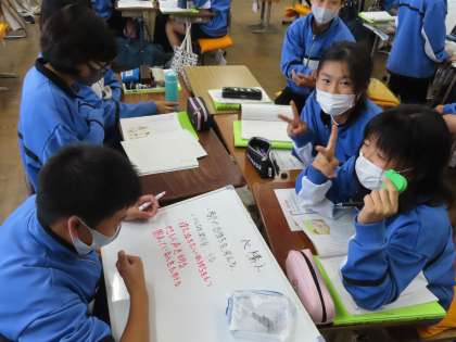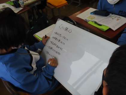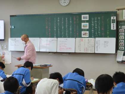 1Cの道徳は鈴木先生が授業をしていました。「ボランティアに参加して」の題材です。ボランティアって何?作者の考えの変化を捉えていました。