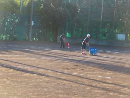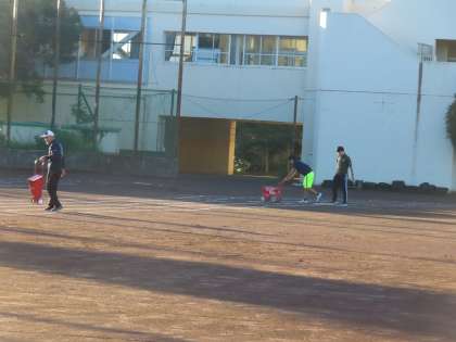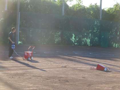 体育科の先生が中心となってライン引きが始まりました。学校に来た先生方がお手伝いをしてくれます。