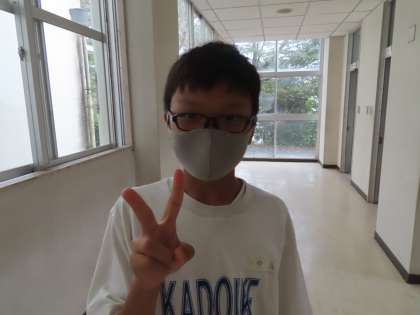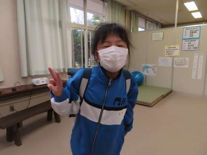 帰りの会が終わるころI組に行きました。ちょうど陽菜さんが下校するところでした。「さようなら」と元気にあいさつしていきました。絢二郎さんは部活動があるので準備をしています。二人との元気にピースサインです。