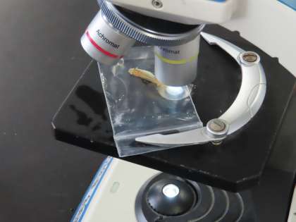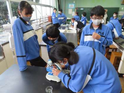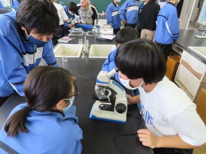 2Dの理科では、顕微鏡を使って監察をしていました。生きているメダカをビニールに入れて監察をしています。「命を維持する働き…ヒメダカの尾を観察して、毛細血管の中の背血球の流れを見てみよう」です。メダカは動くのでピントがなかなか合わなく、苦労していました。