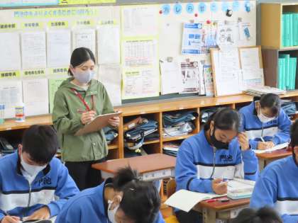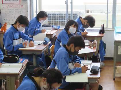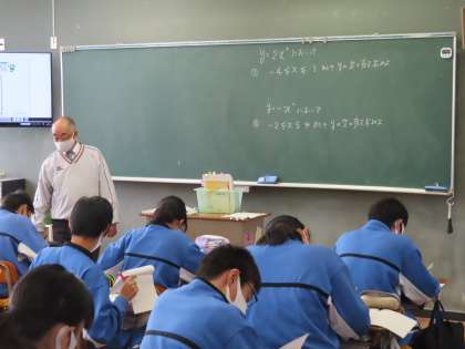 3Bは数学です。授業前にはプリント学習では、基礎的な問題にチャレンジしています。出来そうな問題には気がゆるむので、もったいない間違いをしやすいです。気をつけましょう。今日は関数の問題を行います。