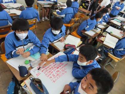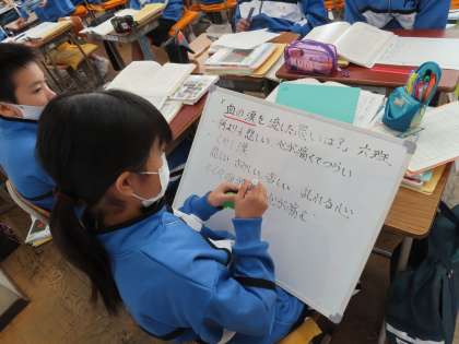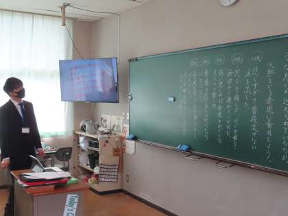ICは国語の授業です。「竹取物語」を行っていました。今日は伊藤先生の研修授業です。教職員センターから山田アドバイザーに来校していただき研修を行いました。「血の涙」と「普通の涙」の違いを班で話し合い、発表していきました。