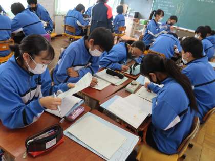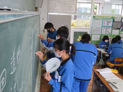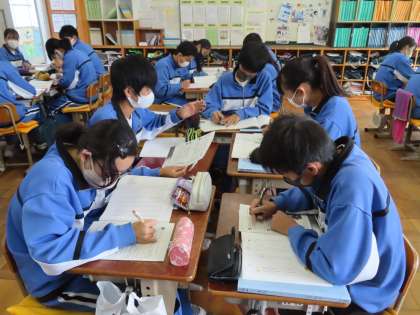 後半は「卒業間近にレクレーションをすることにしました。何をしたいですか?その理由も含め考えてください。との質問にそれぞれ意見が班内で出されました。その意見をどのようにまとめ決めますか?「多数決」「話し合い」などの意見が出ました。まとめに加藤先生が、最後の中学校生活、価値観の違う人同士ですが話し合う喜び、違う価値を持っている人との意見交換を楽しみましょうとまとめていきました。