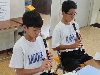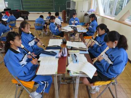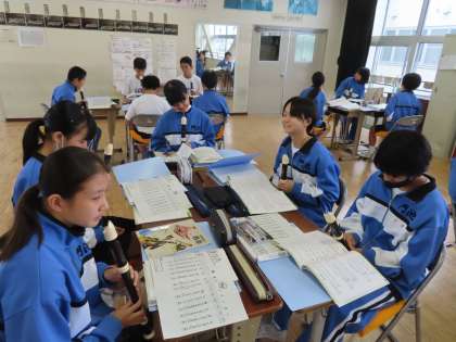 1Bは旧音楽室でアルトリコーダーの練習をしていました。「運指表」を使ってドレミ・・・と吹いていました。指が思うように動いてくれません。苦戦しながら少しずつ上手になっていきます。