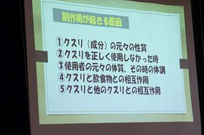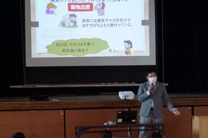 まず、学校薬剤師の野秋様の講話を聴いていきます。薬の役割や薬の主作用・副作用について、薬が効く仕組み、たばこの害などについて話していただきました。