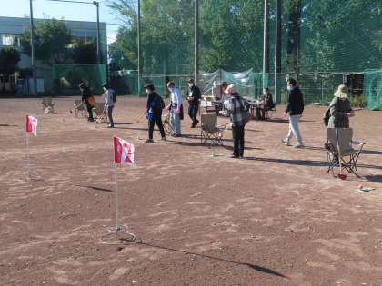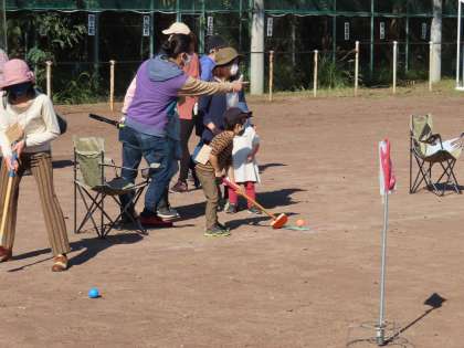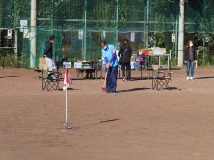 チェックポイントとなった門池中学校のグラウンドでは、御堂林自治会のかたが準備をしていました。グランドゴルフのチェックポイントです。皆さん楽しそうな時間を過ごしていました。」