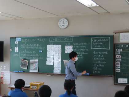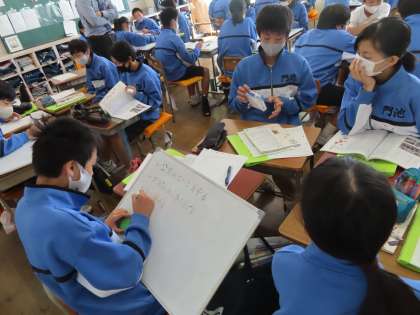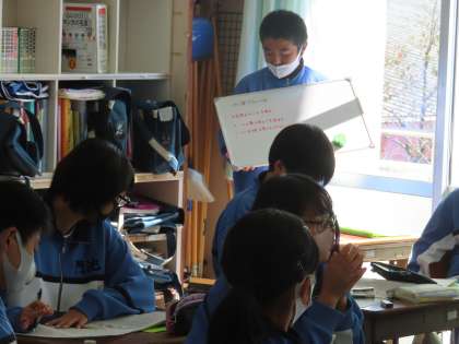 1Cは伊藤先生の道徳です。公徳心について話をしていました。「ゴミ箱をもっと増やして」のお話です。誰もが気持ちよく生活していくために心がけたいことを班で話し合っていきました。ボードを使っての発表です。