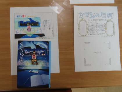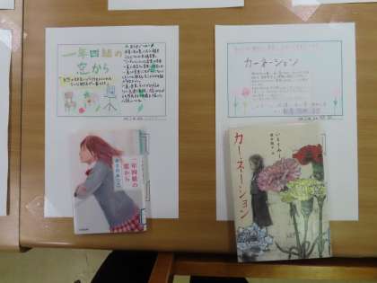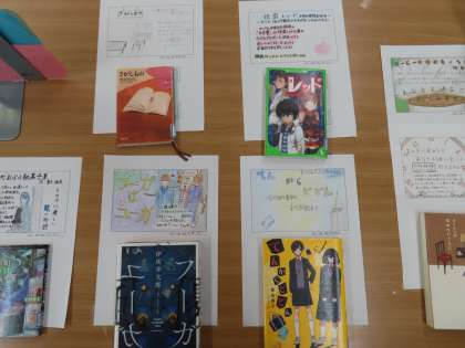 2年生が作ってくれた、紹介カードが図書室の机の上に貼られています。すごく丁寧に作ってくれました。