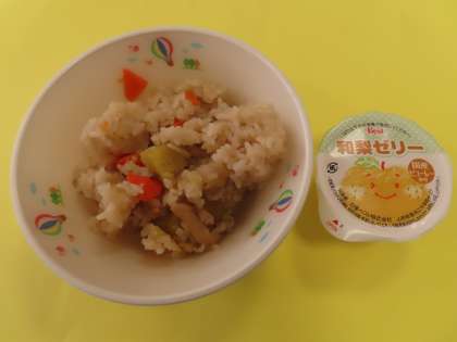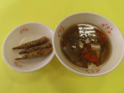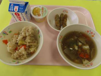 ごはんは炊き込みごはんでした。秋の味覚がたくさん入っています。しめじ、栗、サツマイモなどが入っていました。おいしかったです。ごちそうさまでした。
