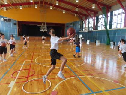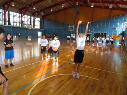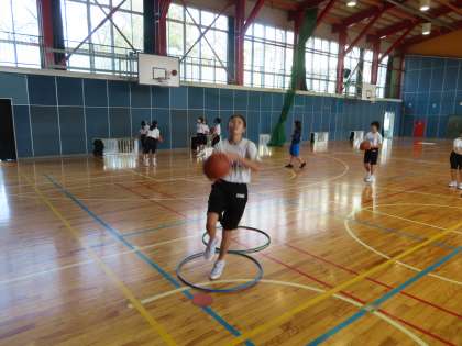1Bが体育館で体育の授業をしていました。バスケットボールです。小学校より大きくて重くなったバスケットボールでシュート練習をしていました。