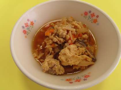 親子丼の具をごはんにのせて食べる方がおいしいです。ごはんをおいしく食べるどんぶりのよさを改めて感じました。はんぺんフライもサクサクと揚がっていておいしかったです。