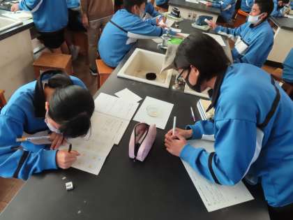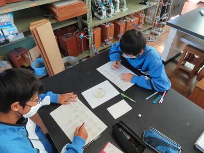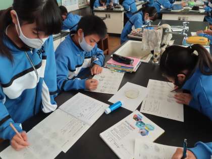 1Cは理科の授業でした。「観察」をしています。内容は「水溶液」です、今日は、物質はどのように水に溶けていくのか?を観察していました。数秒単位で観察した内容の「絵」を書き写していきます。「じーーー」と観察していました。
