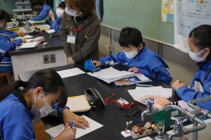 2Cは理科です。並列回路に流れる電流の大きさを測定した実験の結果をまとめています。結果から考えられることを話し合っています。