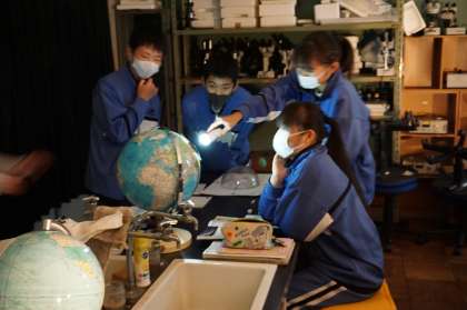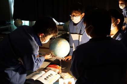 3Aは理科です。太陽の光の当たり方を調べています。地球の地軸の傾きによって、光の当たり方が変わっていることが、地球儀を使うことで実感できているようです。