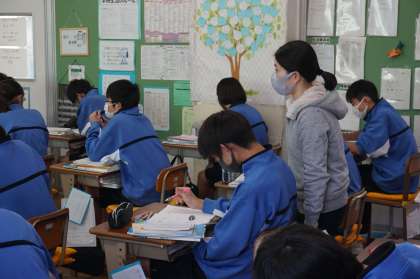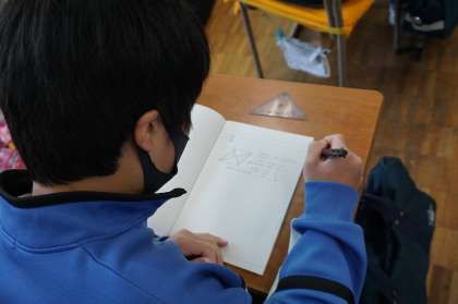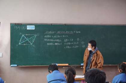 2Dは数学です。平行四辺形の性質に関することを証明していきます。三角形の合同条件に当てはめていきます。三角形と平行線の性質はこれまでも使ってきたことなので、比較的スムーズに証明ができています。