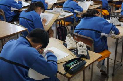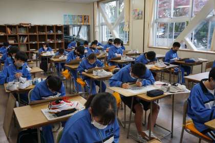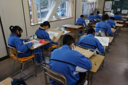 1Bは美術です。上履きのスケッチを進めています。みな真剣です。
