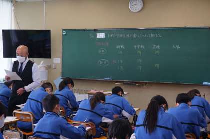1Bは言語読解です。日米の学校生活の違いについて知ろう。ということで、カラマズー市の中学生が書いた紹介文を読み取っています。