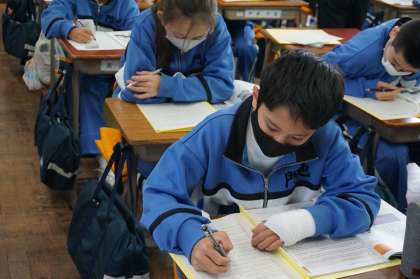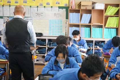 1Bは言語読解です。日米の学校生活の違いについて知ろう。ということで、カラマズー市の中学生が書いた紹介文を読み取っています。