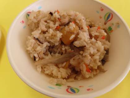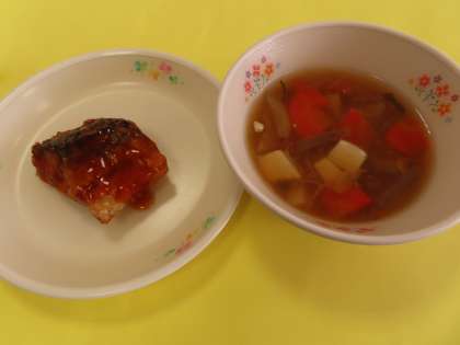奥久慈ごはんは、炊き込みごはんのようなものです。ゴボウ、椎茸、栗、湯葉、鶏肉などの炊き込みごはんでした。具材がたくさんありおいしくいただきました。ごちそうさまでした。鯖のピリ辛ソースは甘辛くてごはんに合います。ごちそうさまでした。