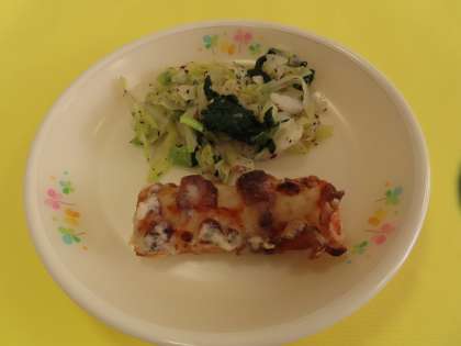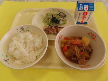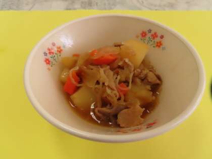 行儀が悪いかもしれませんが、ごはんの上に肉じゃがをかけたらおいしかったです。また、ちくわがもちもちしていました。きゃべつのゆかり和えは口の中をさっぱりしてくれます。ごちそうさまでした。