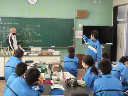 1Aは理科の授業です。「鏡で反射した光の進み方を調べよう」の実験をしていました。光の進み方を方眼紙の中で定規を使って考えていました。そして身振り手振りで発表しています。