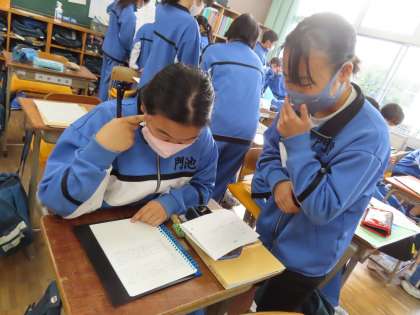 2Cはこの時間に発表会が行われます。グループごとに発表の準備をしています。原稿の最終確認や模擬発表をしているところです。