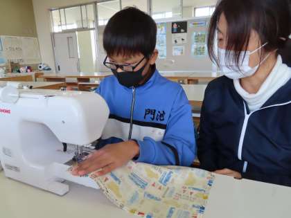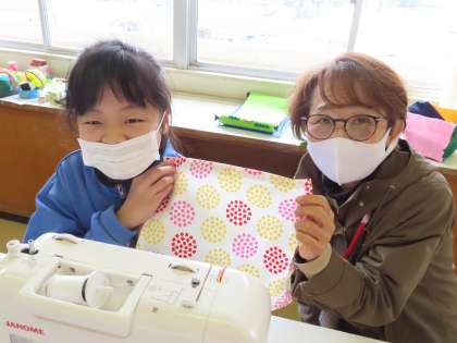 ミシンを使って作品作りを行っていました。支援員の山本さんも一緒に授業をしています。二人ともまっすぐ縫うことが出来たと褒めてもらっていました。本当にきれいに縫えていました。上達がすごいです。